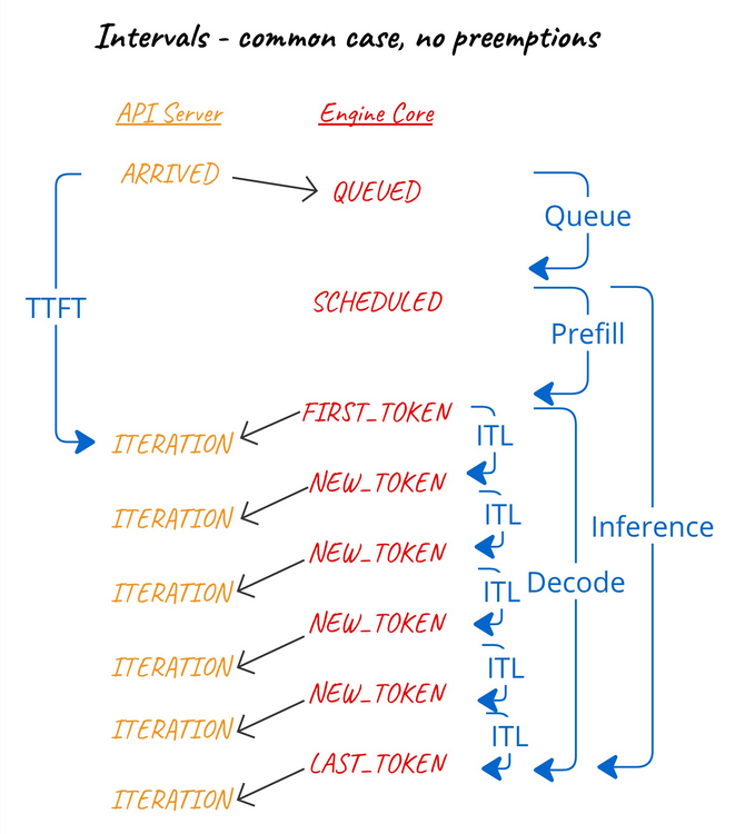 - Server-level metrics: Global metrics that track the state and performance of the LLM engine. These are typically exposed as Gauges or Counters in Prometheus.